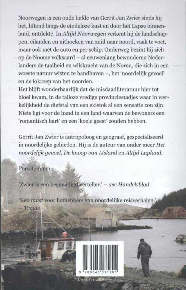 Noorwegen is een oude liefde van Gerrit Jan Zwier. Vele anderen hebben inmiddels de charme van het koele, stille noorden gevonden, waar de grootse natuur niet tot tuintjes en parkjes is getemd. In Altijd Noorwegen verkent Zwier de landschappen, eilanden en uithoeken van zuid naar noord, vaak te voet, maar ook met de auto en per schip.