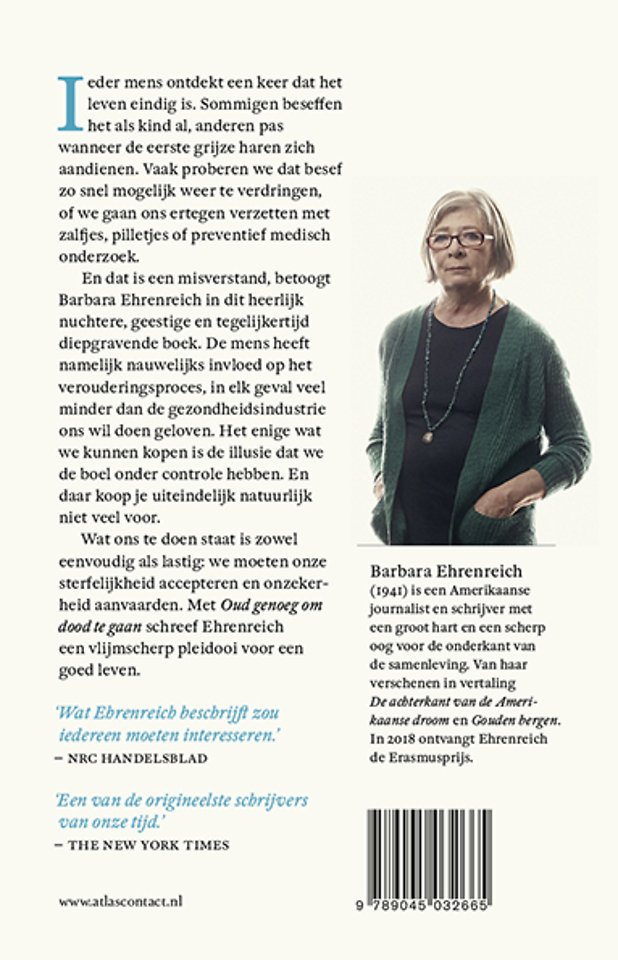 Oud genoeg om dood te gaan van Barbara Ehrenreich, winnaar van de Erasmusprijs 2018, is een vlijmscherp pleidooi voor een goed leven. Ieder mens ontdekt een keer dat het leven eindig is. Sommigen beseffen het als kind al, anderen pas wanneer de eerste grijze haren zich aandienen. Vaak proberen we dat besef zo snel mogelijk weer te verdringen, of we gaan ons ertegen verzetten met zalfjes, pilletjes of preventief medisch onderzoek. En dat is een misverstand, betoogt Ehrenreich in dit heerlijk nuchtere, geestige en tegelijkertijd diepgravende boek.