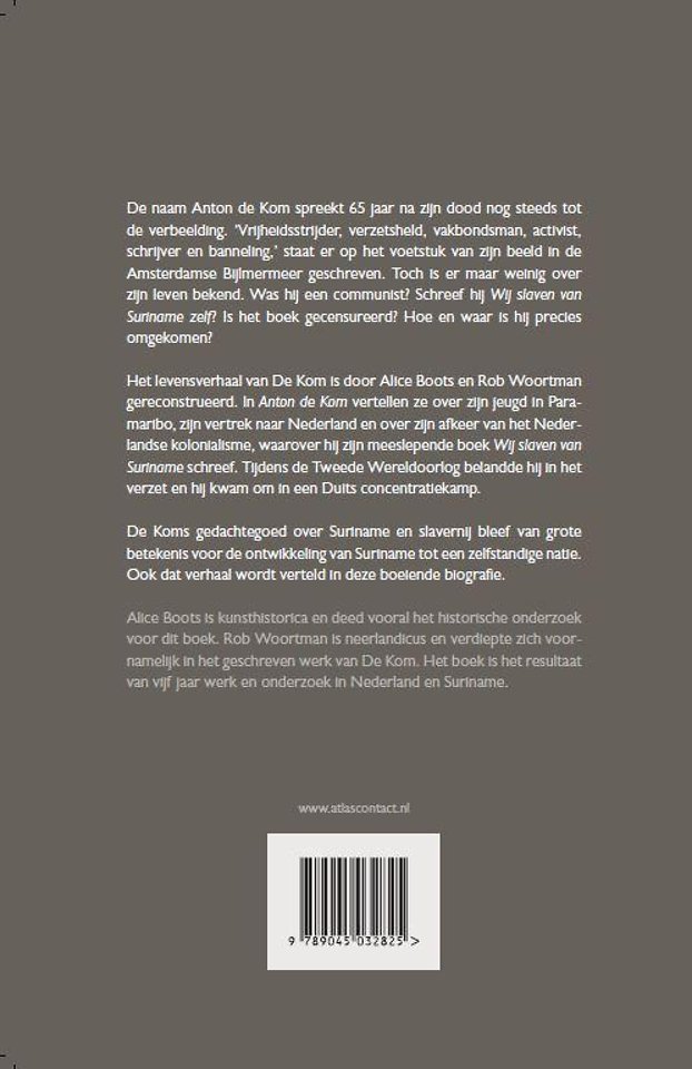 In Anton de Kom vertellen Alice Boots en Rob Woortman over zijn jeugd in Paramaribo, zijn vertrek naar Nederland en over zijn afkeer van het Nederlandse kolonialisme, waarover hij zijn meeslepende boek Wij slaven van Suriname schreef.