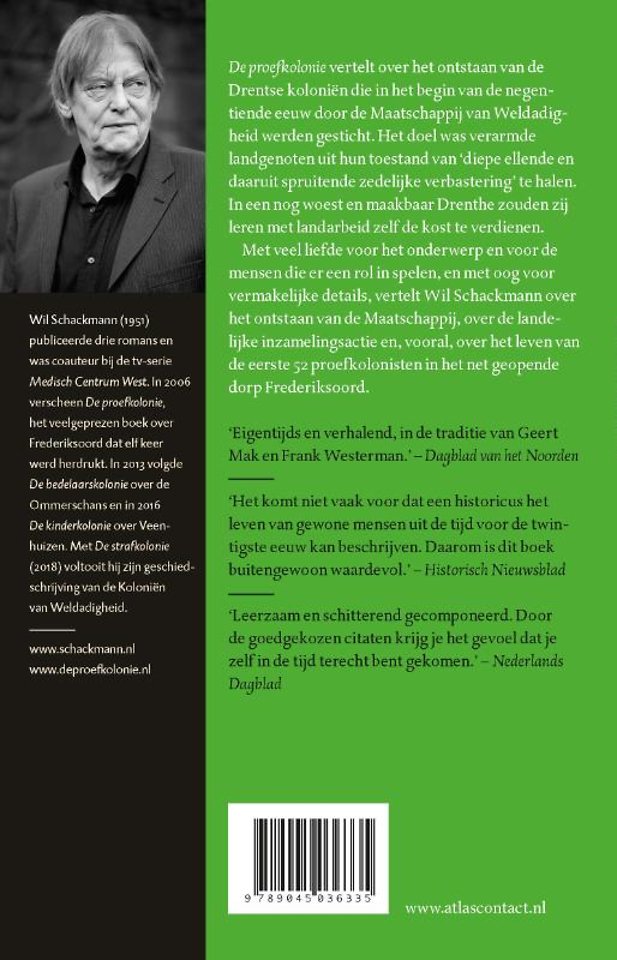 In ‘De proefkolonie’ vertelt auteur Wil Schackmann over het ontstaan van de Drentse koloniën die in het begin van de negen-tiende eeuw door de Maatschappij van Weldadig-heid werden gesticht. Het doel was verarmde landgenoten uit hun toestand van ‘diepe ellende en daaruit spruitende zedelijke verbastering’ te halen. In een nog woest en maakbaar Drenthe zouden zij leren met landarbeid zelf de kost te verdienen.
