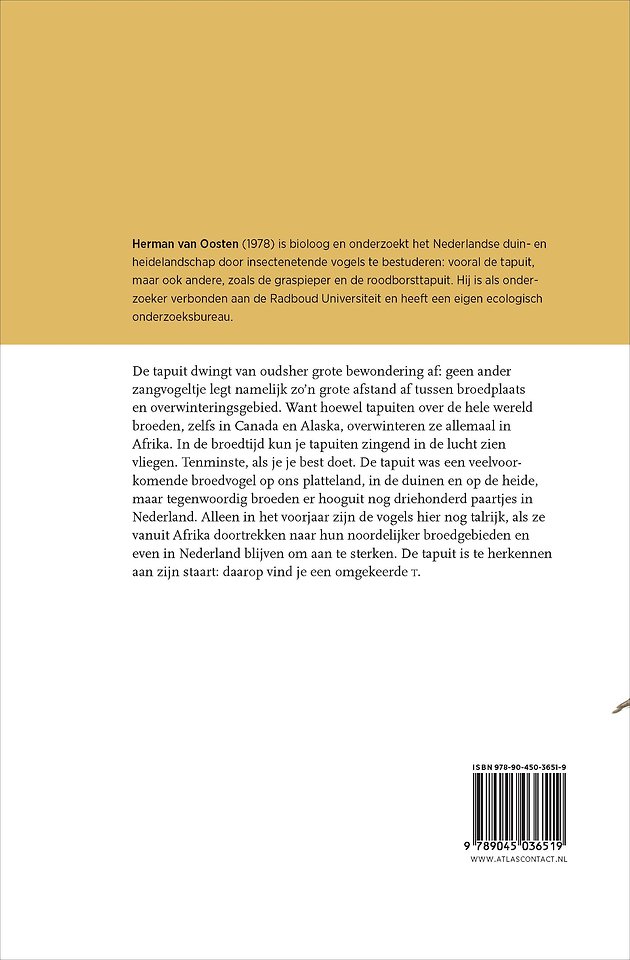 De tapuit dwingt van oudsher grote bewondering af: geen ander zangvogeltje legt namelijk zo’n grote afstand af tussen broedplaats en overwinteringsgebied. Want hoewel tapuiten over de hele wereld broeden, zelfs in Canada en Alaska, overwinteren ze allemaal in Afrika. In de broedtijd kun je tapuiten zingend in de lucht zien vliegen. Tenminste, als je je best doet. De tapuit was een veelvoorkomende broedvogel op ons platteland, in de duinen en op de heide, maar tegenwoordig broeden er hooguit nog driehonderd paartjes in Nederland. Alleen in het voorjaar zijn de vogels hier nog talrijk, als ze vanuit Afrika doortrekken naar hun noordelijker broedgebieden en even in Nederland blijven om aan te sterken. De tapuit is te herkennen aan zijn staart: daarop vind je een omgekeerde T.