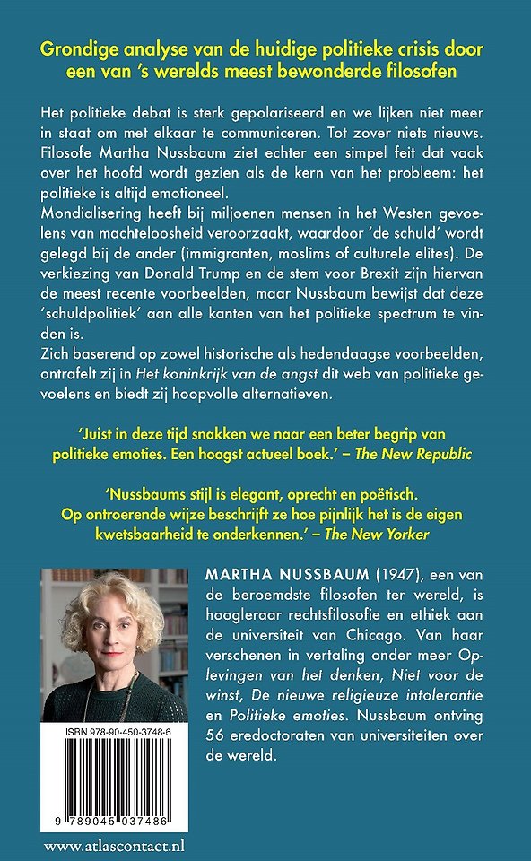Zich baserend op zowel historische als hedendaagse voorbeelden, ontrafelt zij in Het koninkrijk van de angst dit web van politieke gevoelens en biedt zij hoopvolle alternatieven.