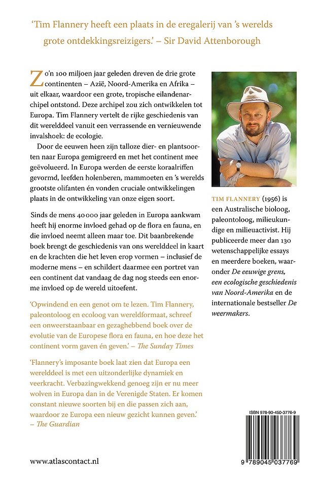 Tim Flannery brengt in zijn baanbrekende boek Europa de geschiedenis van ons werelddeel in kaart en de krachten die het leven erop vormen – inclusief de moderne mens – en schildert daarmee een portret van een continent dat vandaag de dag nog steeds een enorme invloed op de wereld uitoefent. Zo’n 100 miljoen jaar geleden dreven de drie grote continenten – Azië, Noord-Amerika en Afrika – uit elkaar, waardoor een grote, tropische eilandenarchipel ontstond. Deze archipel zou zich ontwikkelen tot Europa. Flannery vertelt de rijke geschiedenis van dit werelddeel vanuit een verrassende en vernieuwende invalshoek: de ecologie. Door de eeuwen heen zijn talloze dier- en plantsoorten naar Europa gemigreerd en met het continent mee geëvolueerd. In Europa werden de eerste koraalriffen gevormd, leefden holenberen, mammoeten en ’s werelds grootste olifanten én vonden cruciale ontwikkelingen plaats in de ontwikkeling van onze eigen soort. Sinds de mens 40 000 jaar geleden in Europa aankwam heeft hij enorme invloed gehad op de flora en fauna, en die invloed neemt alleen maar toe.