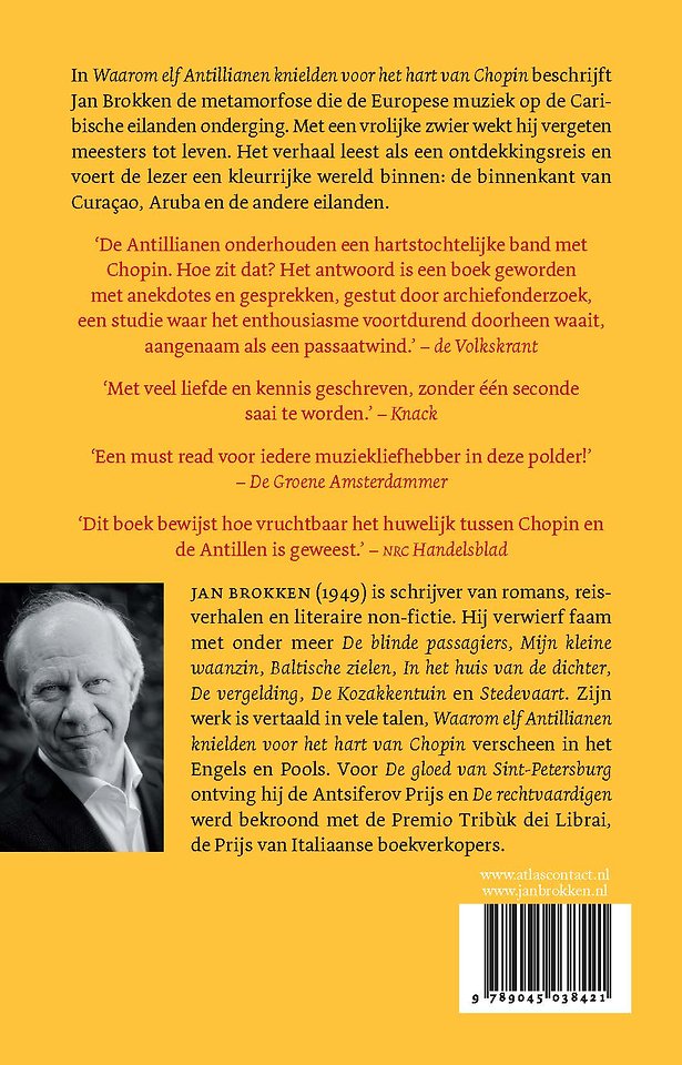 In Waarom elf Antillianen knielden voor het hart van Chopin beschrijft Jan Brokken de wortels van de Antilliaanse muziek en de invloed die Europa heeft uitgeoefend. Het verhaal leest als een ontdekkingsreis: het voert de lezer een kleurrijke en volslagen onbekende wereld binnen.