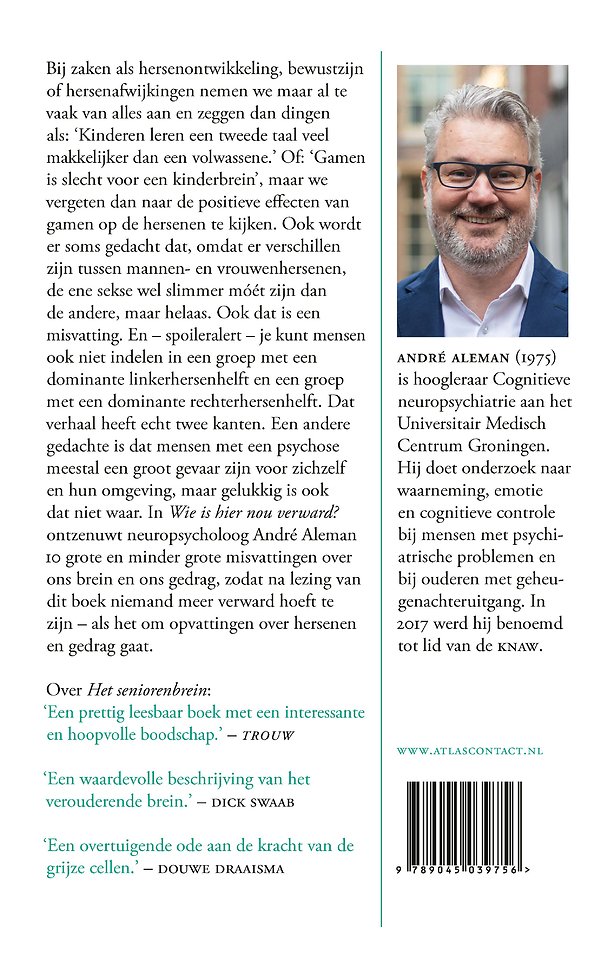 Gelukkig niet, laat hoogleraar neuropsychiatrie en schrijver van 'Het seniorenbrein' André Aleman overtuigend zien in 'Wie is nou hier verward?'. Toegankelijk en met vaardige pen weerlegt hij in zijn nieuwe boek tien misvattingen over onze bovenkamer. Wie is hier nou verward? Na lezing van dit boek niemand meer.