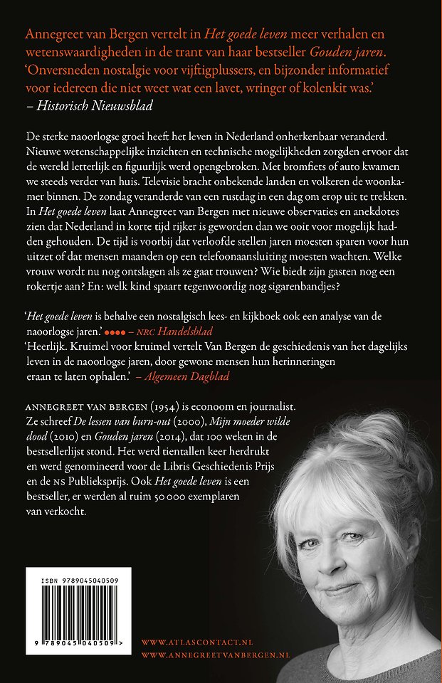 In 'Het goede leven' pakt Annegreet van Bergen de draad op van haar bestseller 'Gouden jaren' en laat ze met nieuwe observaties en anekdotes zien hoe de grote naoorlogse groei het leven in Nederland onherkenbaar heeft veranderd. Huismoeders doen hun boodschappen niet meer met een netje in de hand bij de kruidenier om de hoek.