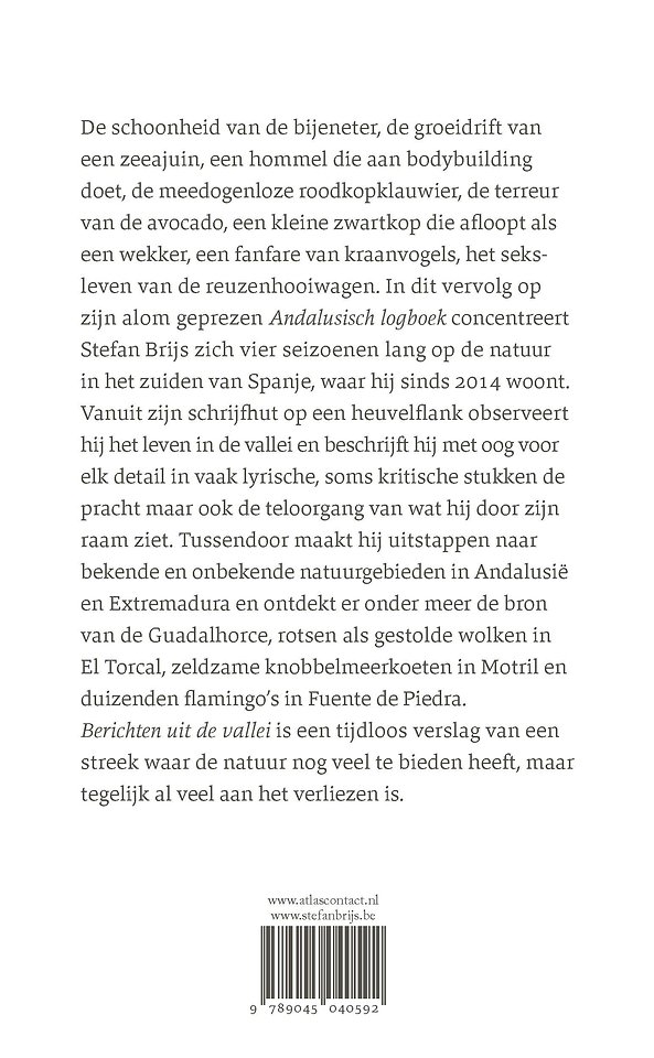 ‘Berichten uit de vallei’ van Stefan Brijs is een tijdloos verslag van een streek waar de natuur nog veel te bieden heeft, maar tegelijk al veel aan het verliezen is. In dit vervolg van het alom geprezen ‘Andalusisch logboek’ concentreert Brijs zich in vier seizoenen lang op de natuur in het zuiden van Spanje, waar hij sinds 2014 woont. Vanuit zijn schrijfhut op een heuvelflank observeert hij het leven in de vallei en beschrijft hij met oog voor elk detail in vaak lyrische, soms kritische stukken de pracht maar ook de teloorgang van wat hij door zijn raam ziet.