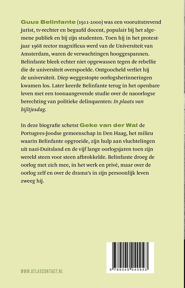 In deze biografie schetst Geke van der Wal de Portugees-Joodse gemeenschap in Den Haag, het milieu waarin Belinfante opgroeide, zijn hulp aan vluchtelingen uit nazi-Duitsland en de vijf lange oorlogsjaren toen zijn wereld steen voor steen afbrokkelde. Belinfante droeg de oorlog met zich mee, in het werk en privé, maar over de oorlog zelf en over de drama’s in zijn persoonlijk leven zweeg hij.