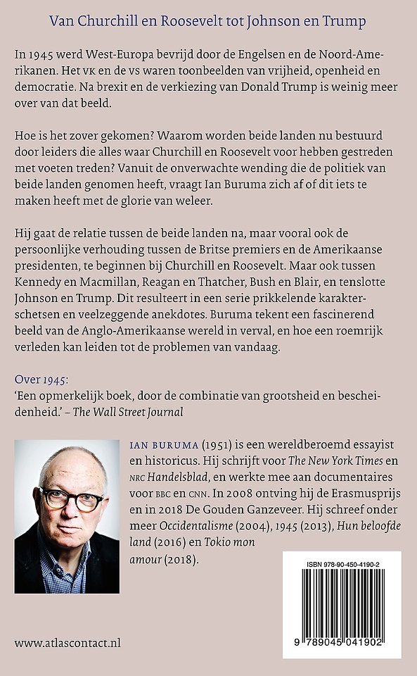 Maar ook tussen Kennedy en MacMillan, Reagan en Thatcher, Bush en Blair, en ten slotte Johnson en Trump. Dat resulteert in een schitterende serie karakterschetsen vol veelzeggende details en anekdotes. Het boek is een masterclass in politieke diplomatie en psychologie. Buruma roept een fascinerend beeld op van de ups en downs in de betrekkingen tussen een groot wereldrijk en een land dat dat ooit was, en maar moeilijk kan accepteren dat het dat niet meer is.