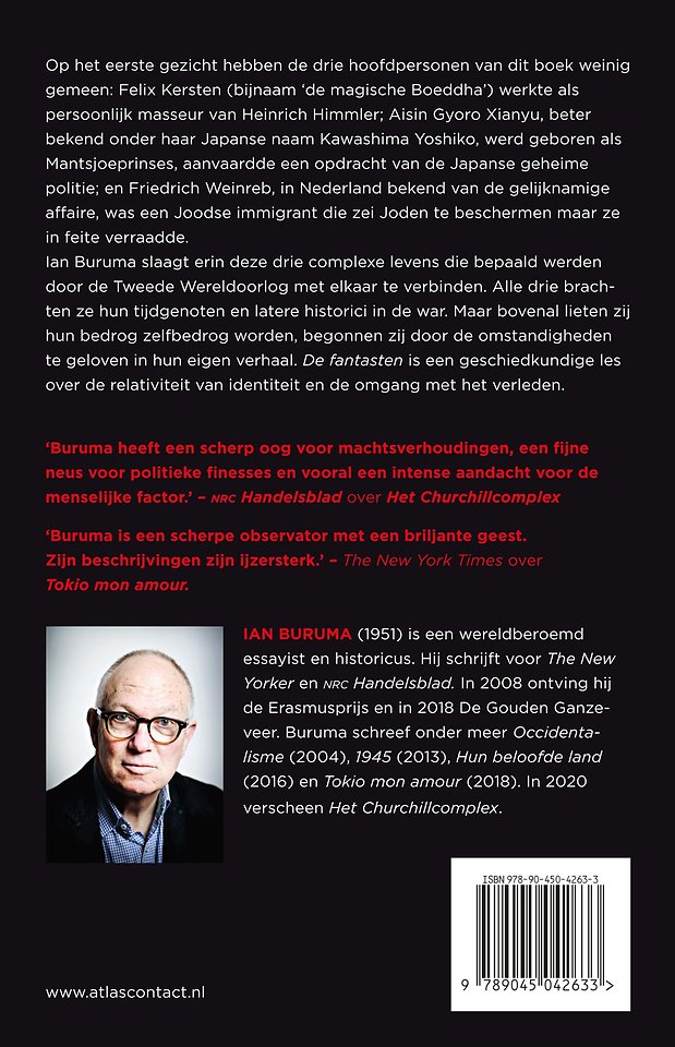 In ‘De fantasten’ slaagt Ian Buruma erin om drie complexe levens die bepaald werden door de Tweede Wereldoorlog met elkaar te verbinden. Op het eerste gezicht hebben de drie hoofdpersonen weinig gemeen: Felix Kersten (bijnaam ‘de magische Boeddha’) werkte als de persoonlijke masseur van Heinrich Himmler. Aisin Gyoro Xianyu, beter bekend onder haar Japanse naam Kawashima Yoshiko (of de bijnaam het ‘Oosterse Juweel’) werd geboren als Manchuprinces, aanvaardde een opdracht van de Japanse geheime politie. En Frederik Weinreb, in Nederland bekend van de gelijknamige affaire, was een Joodse immigrant die zei Joden te beschermen maar ze in feite verraadde. Alle drie brachten ze hun tijdgenoten en latere historici in de war. Maar bovenal lieten zij hun bedrog zelfbedrog worden, begonnen zij door de omstandigheden te geloven in hun eigen verhaal. De fantasten is een geschiedkundige les over de relativiteit van identiteit en de omgang met het verleden