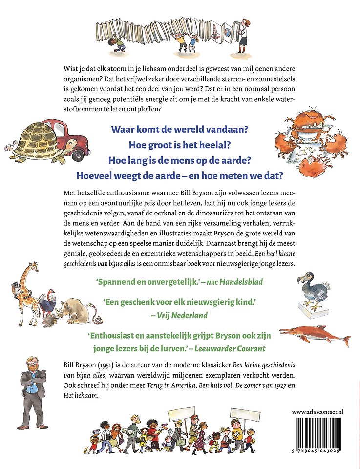 Waar komt de wereld vandaan? Hoe lang is de mens al op de aarde? Hoe groot is het heelal? Vragen die niet alleen volwassenen, maar ook kinderen stellen. Want juist kinderen kunnen een onstilbare nieuwsgierigheid aan de dag leggen als het op de grote levensvragen aankomt. Na de tekst- en geïllustreerde editie van het succesvolle Een heel kleine geschiedenis van bijna alles verschijnt nu een geïllustreerde editie speciaal voor de jeugd. Met hetzelfde enthousiasme waarmee Bill Bryson zijn volwassen lezers meeneemt op een avontuurlijke reis door het leven kunnen ook jonge lezers met de wereld kennismaken, vanaf de big bang tot het ontstaan van de mens en verder. Op een heldere en spannende manier laat Bryson hen kennismaken met de meest essentiële onderwerpen uit de bètawetenschappen.
