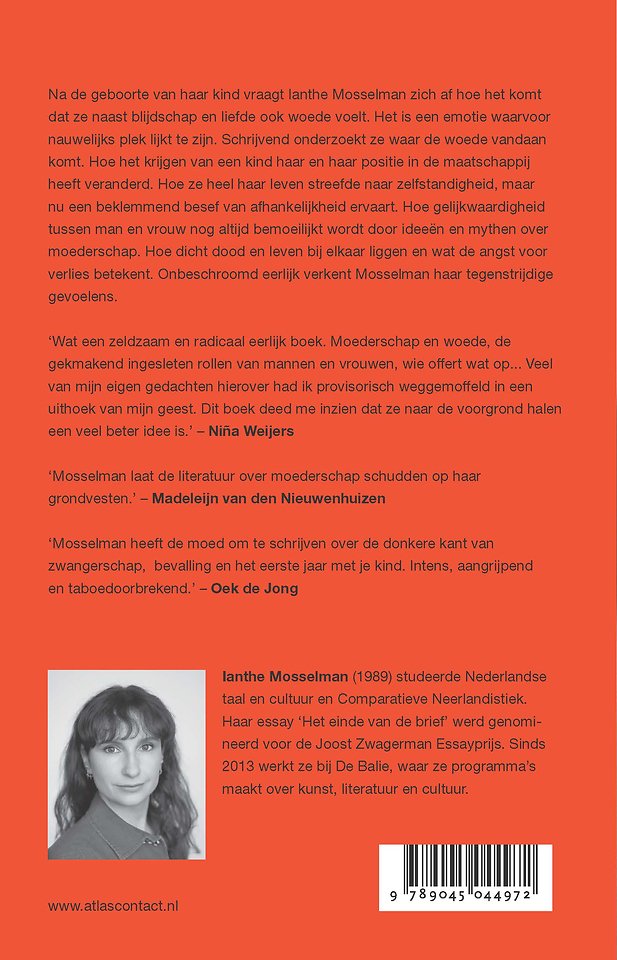 In ‘Al die liefde en woede’ vraagt Ianthe Mosselman zich na de geboorte van haar kind af hoe het komt dat ze naast blijdschap en liefde ook woede voelt. Waar komt die woede vandaan? Betekent het krijgen van een kind niet alleen een verrijking maar ook het verlies van iets? Onbeschroomd eerlijk verkent Mosselman haar tegenstrijdige gevoelens. Het krijgen van een kind heeft haar positie in de maatschappij veranderd. Heel haar leven streefde ze naar zelfstandigheid, maar sinds de geboorte van haar kind ervaart ze een beklemmend besef van afhankelijkheid. Gelijkwaardigheid tussen man en vrouw wordt nog altijd bemoeilijkt door de ideeën en mythen over moederschap. En wat betekent het om zo veel van iemand te houden terwijl het je ook zo veel angst bezorgt? Want de keerzijde van liefde en geluk is de vrees voor verlies ervan.