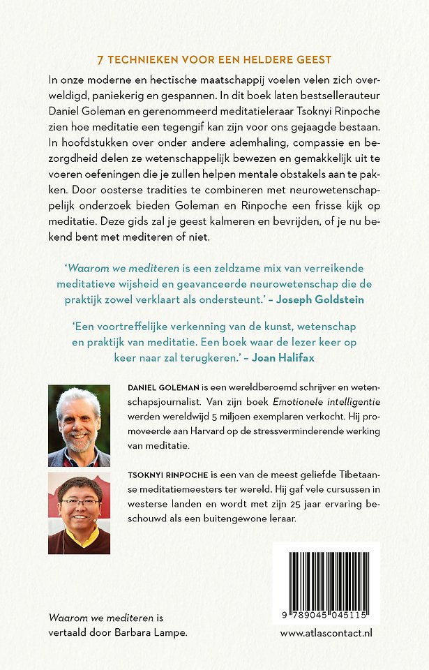 Negatieve emoties zijn menselijk. Maar in een wereld met zoveel hectiek en druk als de onze kunnen dergelijke emoties al snel destructief worden. In Waarom we mediteren laten bestsellerauteur Daniel Goleman en gerenommeerd meditatieleraar Tsoknyi Rinpoche zien hoe meditatie een tegengif kan zijn voor de doordravende moderne wereld.