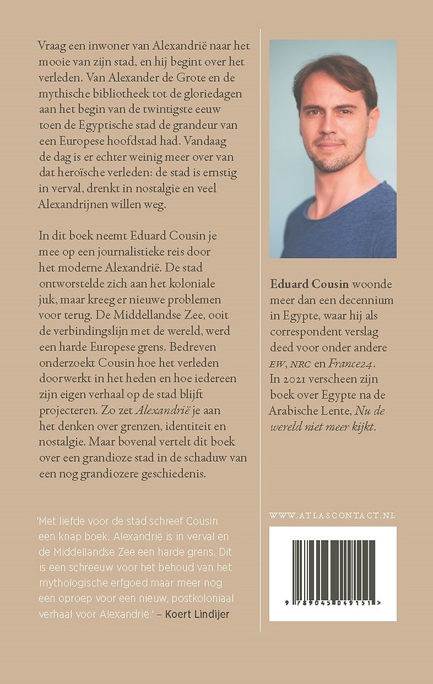 In dit boek neemt Eduard Cousin de lezer mee op een journalistieke reis door de moderne geschiedenis van Alexandrië. De stad ontworstelde zich aan het koloniale juk, maar kreeg er nieuwe problemen voor terug. De Middellandse Zee, ooit de verbindingslijn met de wereld, werd een harde Europese grens. Bedreven onderzoekt Cousin hoe de geschiedenis doorwerkt in het heden en hoe iedereen zijn eigen verhaal op de stad blijft projecteren. Alexandrië is een boek dat je aan het denken zet over culturele grenzen, identiteit en nostalgie. Maar bovenal vertelt het over een grandioze stad in de schaduw van een nog grandiozere geschiedenis.