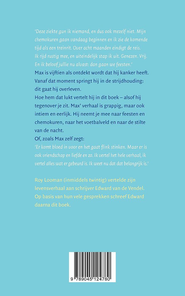 Max is vijftien als ontdekt wordt dat hij kanker heeft. Vanaf dat moment springt hij in de strijdhouding: dit gaat hij overleven. Hoe hem dat lukt vertelt hij in dit boek – alsof hij tegenover je zit. Max’ verhaal is grappig, maar ook intiem en eerlijk. Hij neemt je mee naar feesten en chemokuren, naar het voetbalveld en naar de stilte van de nacht. Of, zoals Max zelf zegt: ‘Er komt bloed in voor en het gaat flink stinken. Maar er is ook vriendschap en liefde en zo. Ik vertel het hele verhaal, ik vertel alles wat er gebeurd is. Ik weet nu dat dat belangrijk is.’