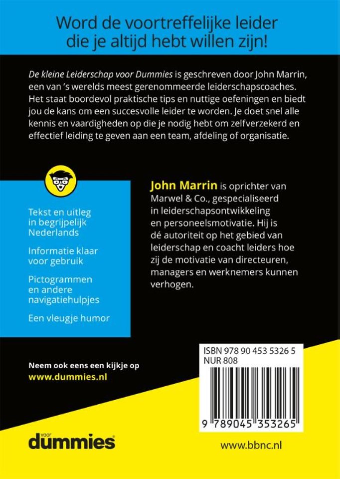 'De kleine Leiderschap voor Dummies' is geschreven door John Marrin, een van 's werelds meest gerenommeerde leiderschapscoaches. Het staat boordevol praktische tips en nuttige oefeningen en biedt jou de kans om een succesvolle leider te worden. Je doet snel alle kennis en vaardigheden op die je nodig hebt om zelfverzekerd en effectief leiding te geven aan een team, afdeling of organisatie!