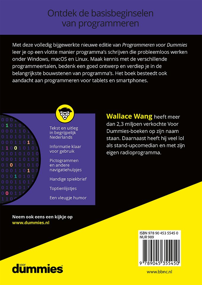 Met de volledig bijgewerkte nieuwe editie van 'Programmeren voor Dummies' leer je op een vlotte manier programma's schrijven die probleemloos werken onder Windows, macOS en Linux. Maak kennis met de verschillende programmeertalen, bedenk een goed ontwerp en verdiep je in de belangrijkste bouwstenen van programma's.