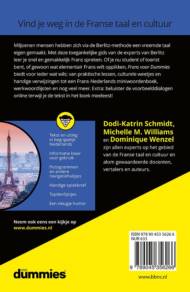 Miljoenen mensen hebben zich via de Berlitz-methode een vreemde taal eigen gemaakt. Met deze toegankelijke gids van de experts van Berlitz leer je snel en gemakkelijk Frans spreken. Of je nu student of toerist bent, of gewoon wat elementair Frans wilt oppikken, Frans voor Dummies biedt voor ieder wat wils: van praktische lessen, culturele weetjes en handige verwijzingen tot een Frans-Nederlands miniwoordenboek, werkwoordlijsten en nog veel meer. Extra: beluister de voorbeelddialogen online terwijl je de tekst in het boek meeleest!