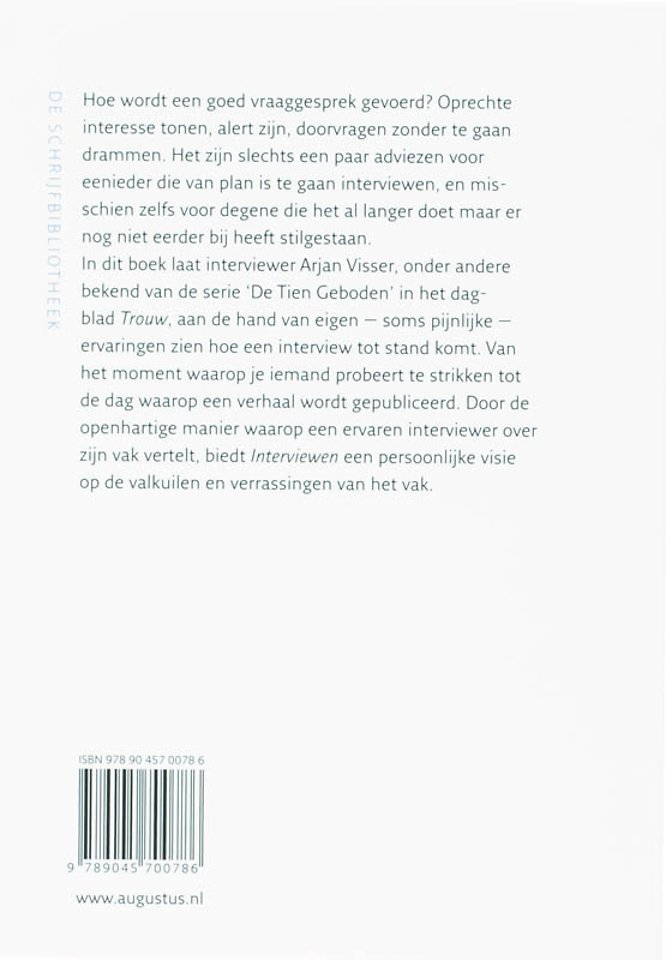 In dit boek laat interviewer Arjan Visser, onder andere bekend van de serie 'De Tien Geboden' in het dagblad Trouw, aan de hand van eigen - soms pijnlijke - ervaringen zien hoe een interview tot stand komt. Van het moment waarop u iemand probeert te strikken tot de dag waarop een verhaal wordt gepubliceerd. Door de openhartige manier waarop een ervaren interviewer over zijn vak vertelt, biedt 'Interviewen' een persoonlijke visie op de valkuilen en verrassingen van het vak.