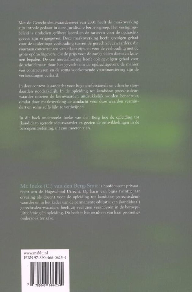 Met de Gerechtsdeurwaarderswet van 2001 heeft de marktwerking zijn intrede gedaan in deze juridische beroepsgroep. Het vestigingsbeleid is sindsdien geliberaliseerd en de tarieven voor de opdrachtgevers zijn vrijgegeven. Deze marktwerking heeft gevolgen gehad voor de onderlinge verhouding tussen de gerechtsdeurwaarders, die voortaan concurrenten van elkaar zijn, en voor de verhouding met de grote opdrachtgevers, die de prijs voor de aangeboden diensten kunnen bepalen. De commercialisering heeft ook gevolgen gehad voor de schuldenaar: door het gevecht om de opdrachtgevers, de manier van contracteren en de soms voorkomende voorfinanciering zijn de verhoudingen verhard. In deze context is aandacht voor hoge professionele en ethische standaarden noodzakelijk. In de opleiding tot kandidaat-gerechtsdeurwaarder moeten de kernwaarden uitdrukkelijk worden benadrukt, omdat door marktwerking de aandacht voor deze waarden vermindert en soms zelfs lijkt te verdwijnen. In dit boek onderzoekt Ineke van den Berg hoe de opleiding tot (kandidaat-)gerechtsdeurwaarder er, gezien de ontwikkelingen in de beroepsuitoefening, uit zou moeten zien.