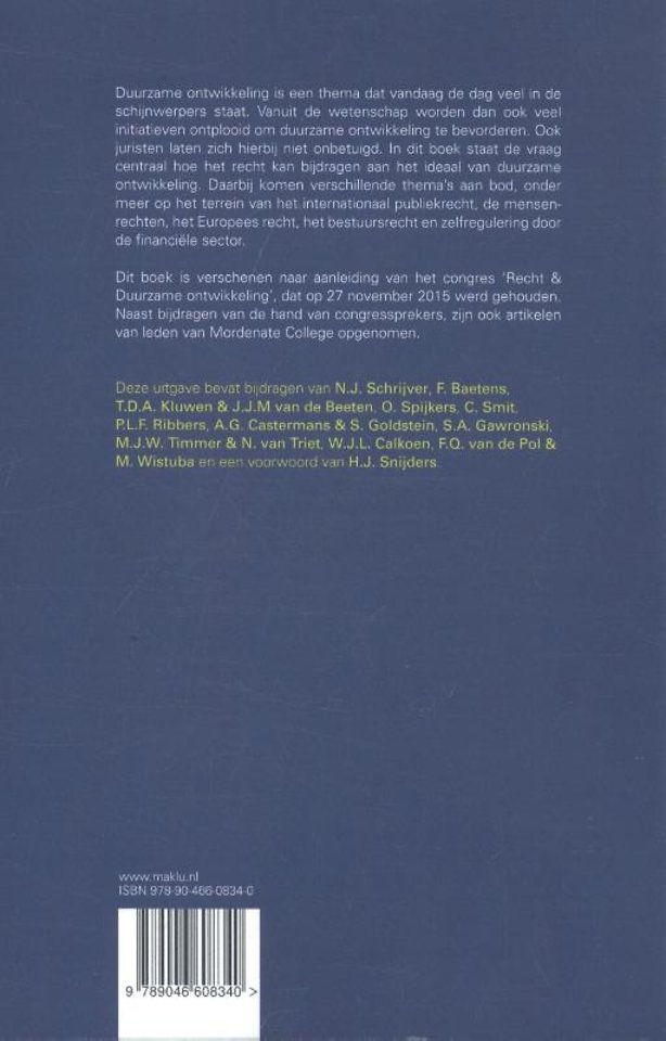 Dit boek is verschenen naar aanleiding van het congres ‘Recht & Duurzame ontwikkeling’, dat op 27 november 2015 werd gehouden. Naast bijdragen van de hand van congressprekers, zijn ook artikelen van leden van Mordenate College opgenomen.