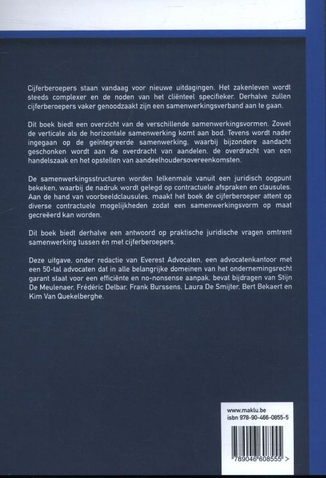 Dit boek biedt een overzicht van de verschillende samenwerkingsvormen. Zowel de verticale als de horizontale samenwerking komt aan bod. Tevens wordt nader ingegaan op de geïntegreerde samenwerking, waarbij bijzondere aandacht geschonken wordt aan de overdracht van aandelen, de overdracht van een handelszaak en het opstellen van aandeelhoudersovereenkomsten. De samenwerkingsstructuren worden telkenmale vanuit een juridisch oogpunt bekeken, waarbij de nadruk wordt gelegd op contractuele afspraken en clausules. Aan de hand van voorbeeldclausules, maakt het boek de cijferberoeper attent op diverse contractuele mogelijkheden zodat een samenwerkingsvorm op maat gecreëerd kan worden. Dit boek biedt derhalve een antwoord op praktische juridische vragen omtrent samenwerking tussen én met cijferberoepers.