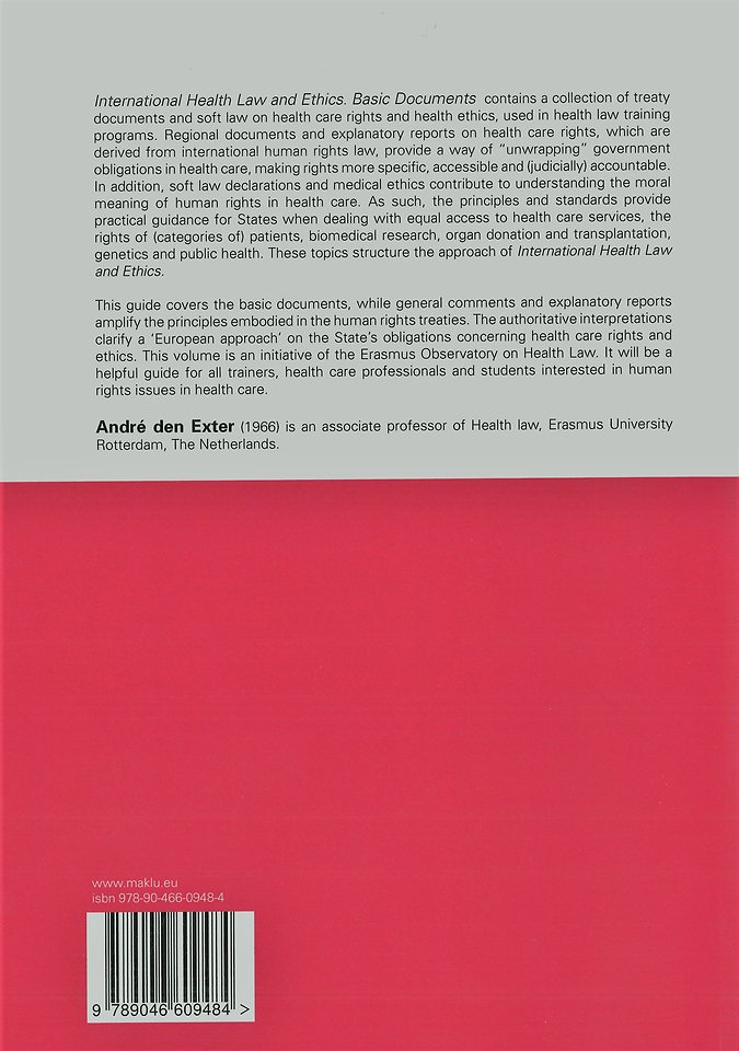 International Health Law and Ethics. Basic Documents contains a collection of treaty documents and soft law on health care rights and health ethics, used in health law training programs. Regional documents and explanatory reports on health care rights, which are derived from international human rights law, provide a way of “unwrapping” government obligations in health care, making rights more specific, accessible and (judicially) accountable. In addition, soft law declarations and medical ethics contribute to understanding the moral meaning of human rights in health care.