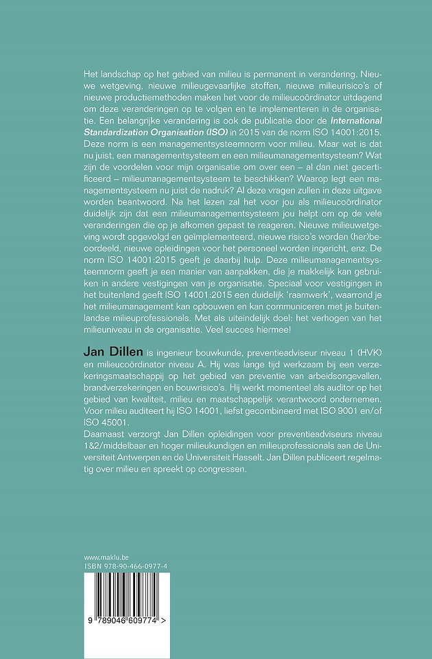 Het landschap op het gebied van milieu is permanent in verandering. Nieuwe wetgeving, nieuwe milieugevaarlijke stoffen, nieuwe milieurisico's of nieuwe productiemethoden maken het voor de milieucoördinator uitdagend om deze veranderingen op te volgen en te implementeren in de organisatie. Een belangrijke verandering is ook de publicatie door de International Standardization Organisation (ISO) in 2015 van de norm ISO 14001:2015. Deze norm is een managementsysteemnorm voor milieu. Maar wat is dat nu juist, een managementsysteem en een milieumanagementsysteem? Wat zijn de voordelen voor mijn organisatie om over een - al dan niet gecertificeerd - milieumanagementsysteem te beschikken? Waarop legt een managementsysteem nu juist de nadruk? Al deze vragen zullen in deze uitgave worden beantwoord. Na het lezen zal het voor jou als milieucoördinator duidelijk zijn dat een milieumanagementsysteem jou helpt om op de vele veranderingen die op je afkomen gepast te reageren. Nieuwe milieuwetgeving wordt opgevolgd en geïmplementeerd, nieuwe risico's worden (her)beoordeeld, nieuwe opleidingen voor het personeel worden ingericht, enz. De norm ISO 14001:2015 geeft je daarbij hulp. Deze milieumanagementsysteemnorm geeft je een manier van aanpakken, die je makkelijk kan gebruiken in andere vestigingen van je organisatie. Speciaal voor vestigingen in het buitenland geeft ISO 14001:2015 een duidelijk 'raamwerk', waarrond je het milieumanagement kan opbouwen en kan communiceren met je buitenlandse milieuprofessionals. Met als uiteindelijk doel: het verhogen van het milieuniveau in de organisatie. Veel succes hiermee!
