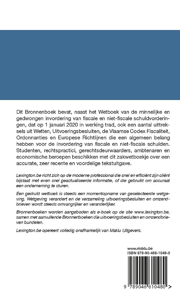 Dit Bronnenboek bevat, naast het Wetboek van de minnelijke en gedwongen invordering van fiscale en niet-fiscale schuldvorderingen, dat op 1 januari 2020 in werking trad, ook een aantal uittreksels uit Wetten, Uitvoeringsbesluiten, de Vlaamse Codex Fiscaliteit, Ordonnanties en Europese Richtlijnen die een algemeen belang hebben voor de invordering van fiscale en niet-fiscale schulden.