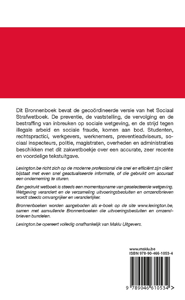 Dit Bronnenboek bevat de gecoördineerde versie van het Sociaal Strafwetboek. De preventie, de vaststelling, de vervolging en de bestraffing van inbreuken op sociale wetgeving, en de strijd tegen illegale arbeid en sociale fraude, komen aan bod. Studenten, rechtspractici, werkgevers, werknemers, preventieadviseurs, sociaal inspecteurs, politie, magistraten, overheden en administraties beschikken met dit zakwetboekje over een accurate, zeer recente en voordelige tekstuitgave.