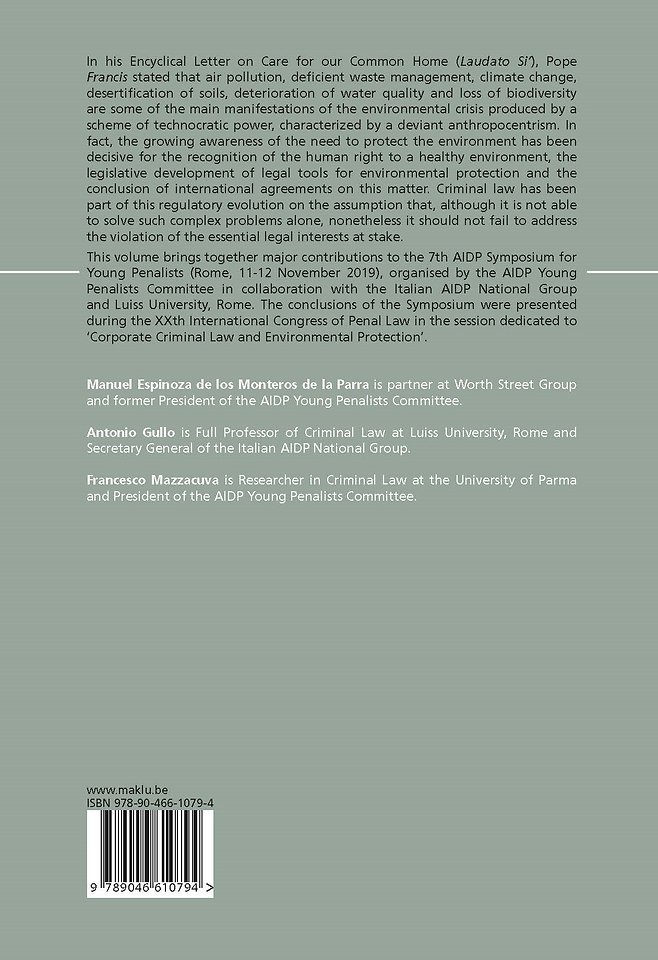 This volume brings together major contributions to the 7th AIDP Symposium for Young Penalists (Rome, 11-12 November 2019), organised by the AIDP Young Penalists Committee in collaboration with the Italian AIDP National Group and Luiss University, Rome. The conclusions of the Symposium were presented during the XXth International Congress of Penal Law in the session dedicated to ‘Corporate Criminal Law and Environmental Protection’.