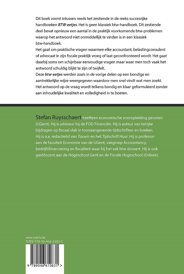 Dit boek vormt intussen reeds het zestiende in de reeks succesrijke handboeken BTW-eetjes. Het is geen klassiek btw-handboek. Dit zestiende deel bevat opnieuw een aantal in de praktijk voorkomende btw-problemen waarop het antwoord niet onmiddellijk te vinden is in een klassiek btw-handboek.