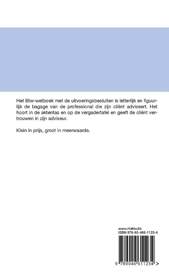 Het Btw-wetboek met de uitvoeringsbesluiten is letterlijk en figuurlijk de bagage van de professional die zijn cliënt adviseert. Het hoort in de aktentas en op de vergadertafel en geeft de cliënt vertrouwen in zijn adviseur.