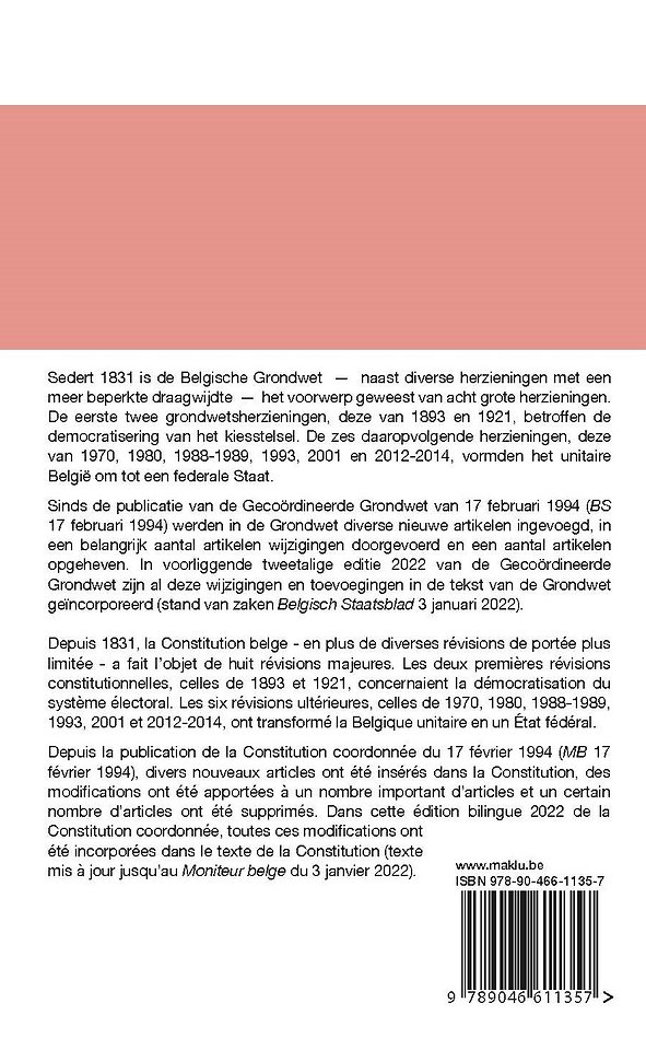 Sinds de publicatie van de Gecoördineerde Grondwet van 17 februari 1994 (BS 17 februari 1994) werden in de Grondwet diverse nieuwe artikelen ingevoegd, in een belangrijk aantal artikelen wijzigingen doorgevoerd en een aantal artikelen opgeheven. In voorliggende tweetalige editie 2022 van de Gecoördineerde Grondwet zijn al deze wijzigingen en toevoegingen in de tekst van de Grondwet geïncorporeerd (stand van zaken Belgisch Staatsblad 3 januari 2022).