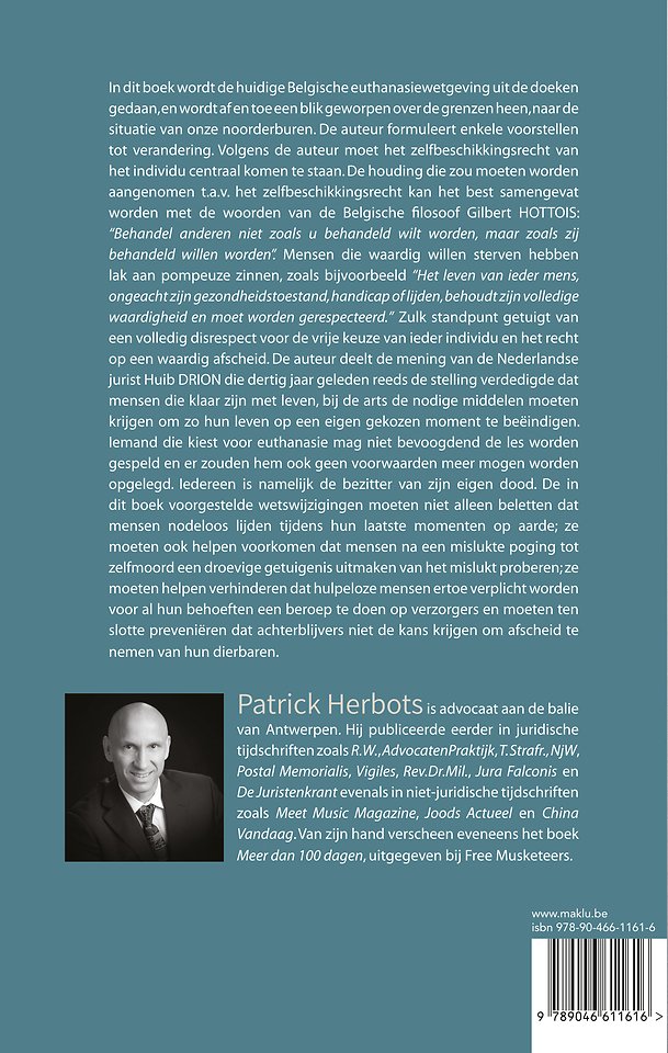 In dit boek wordt de huidige Belgische euthanasiewetgeving uit de doeken gedaan, en wordt af en toe een blik geworpen over de grenzen heen, naar de situatie van onze noorderburen.