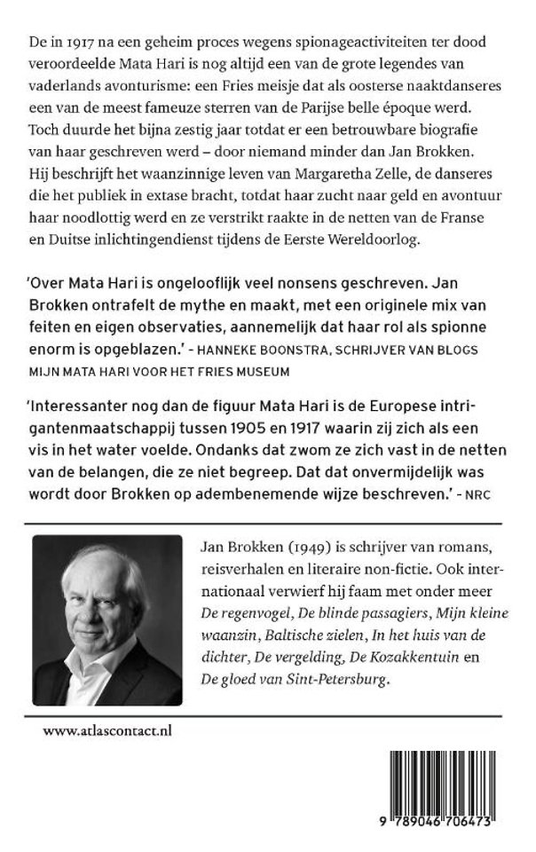 Mata Hari is nog altijd een van de grote legendes van vaderlands avonturisme. Ze groeide van eenvoudig Fries meisje uit tot een oosterse naaktdanseres, en een van de meest fameuze sterren van de Parijse belle époque. Jan Brokken beschrijft haar veelbewogen leven aan de hand van interviews, artikelen, archiefstukken en memoires van tijdgenoten. Geboren als Margaretha Zelle bracht ze als de danseres Mata Hari het publiek in extase, totdat haar zucht naar geld en avontuur haar noodlottig werd en ze verstrikt raakte in de netten van de Franse en Duitse inlichtingendienst tijdens de Eerste Wereldoorlog. In 1917 werd zij na een geheim proces wegens spionageactiviteiten ter dood veroordeeld.