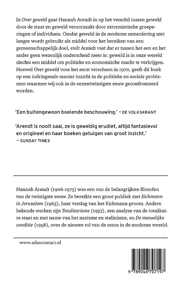 Hoewel 'Over geweld' voor het eerst verscheen in 1970, geeft dit boek op een indringende manier inzicht in de politieke en sociale problemen waarmee wij ook in de eenentwintigste eeuw geconfronteerd worden. Arendt gaat daarvoor in op het verschil tussen geweld door de staat, en dat veroorzaakt door extremistische groeperingen of individuen.