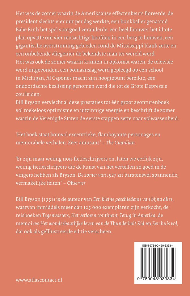 In ‘De zomer van 1927” vervlecht Bill Bryson de zinderende zomer, waarin zo veel gebeurde in de Verenigde Staten en waar zij de eerste stappen zette naar volwassenheid, tot één groot avonturenboek. In deze zomer, waarin de Amerikaanse effectenbeurs floreerde, de president slechts vier uur per dag werkte, een honkballer genaamd Babe Ruth het spel voorgoed veranderde, een beeldhouwer het idiote plan had opgevat om vier reusachtige hoofden in een berg te houwen, een gigantische overstroming gebieden rond de Mississippi blank zette en een onbekende vliegenier de bekendste man ter wereld werd. Het was ook de zomer waarin kranten in opkomst waren, de televisie uitgevonden werd, een bomaanslag werd gepleegd op een school in Michigan, Al Capones macht zijn hoogtepunt bereikte, een ondoordachte beslissing genomen werd die tot de Grote Depressie zou leiden.