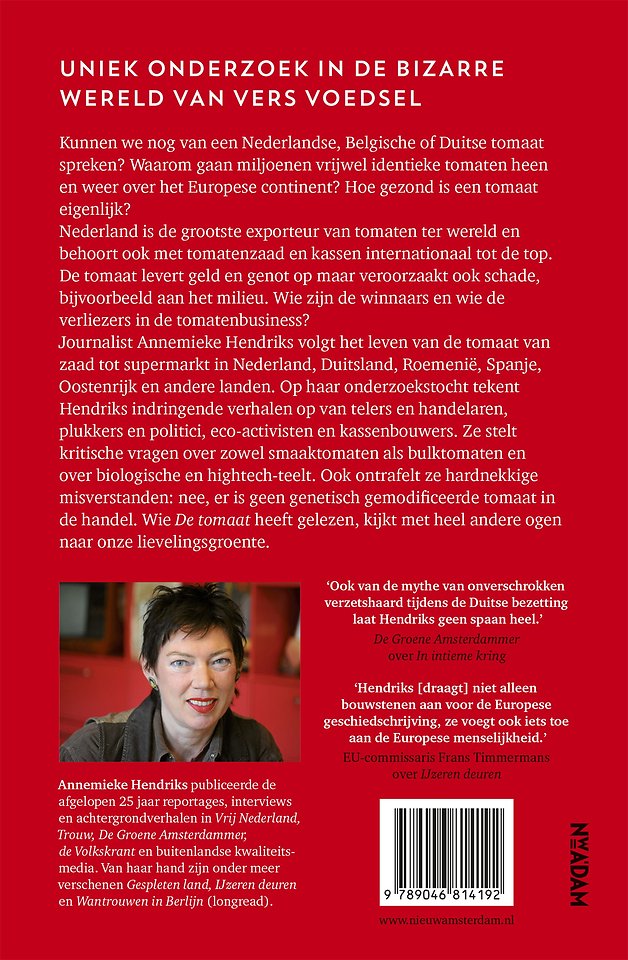Wie zijn de winnaars en wie de verliezers in de tomatenbusiness? Journalist Annemieke Hendriks volgt het leven van de tomaat van zaad tot supermarkt in Nederland, Duitsland, Roemenië, Spanje, Oostenrijk en andere landen. Op haar onderzoekstocht tekent Hendriks indringende verhalen op van telers en handelaren, plukkers en politici, eco-activisten en kassenbouwers. Ze stelt kritische vragen over zowel smaaktomaten als bulktomaten en over biologische en hightech-teelt. Ook ontrafelt ze hardnekkige misverstanden: nee, er is geen genetisch gemodificeerde tomaat in de handel. Wie 'De tomaat' heeft gelezen, kijkt met heel andere ogen naar onze lievelingsgroente.