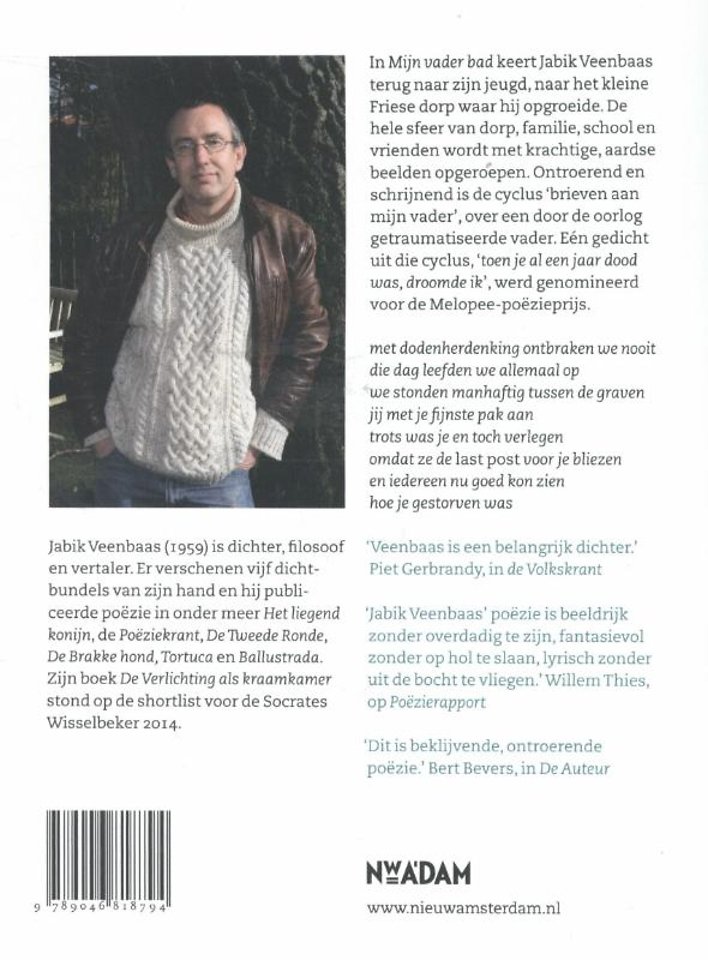 In Mijn vader bad keert Jabik Veenbaas terug naar zijn jeugd, naar het kleine Friese dorp waar hij opgroeide. De bundel heeft een hechte samenhang. De hele sfeer van dorp, familie, school en vrienden wordt op zeer aardse en heldere wijze opgeroepen. Ontroerend en schrijnend is de cyclus 'brieven aan mijn vader', over een door de oorlog getraumatiseerde vader. Eén gedicht uit die cyclus, 'toen je al een jaar dood was, droomde ik', werd genomineerd voor de Melopee-poëzieprijs 2013.