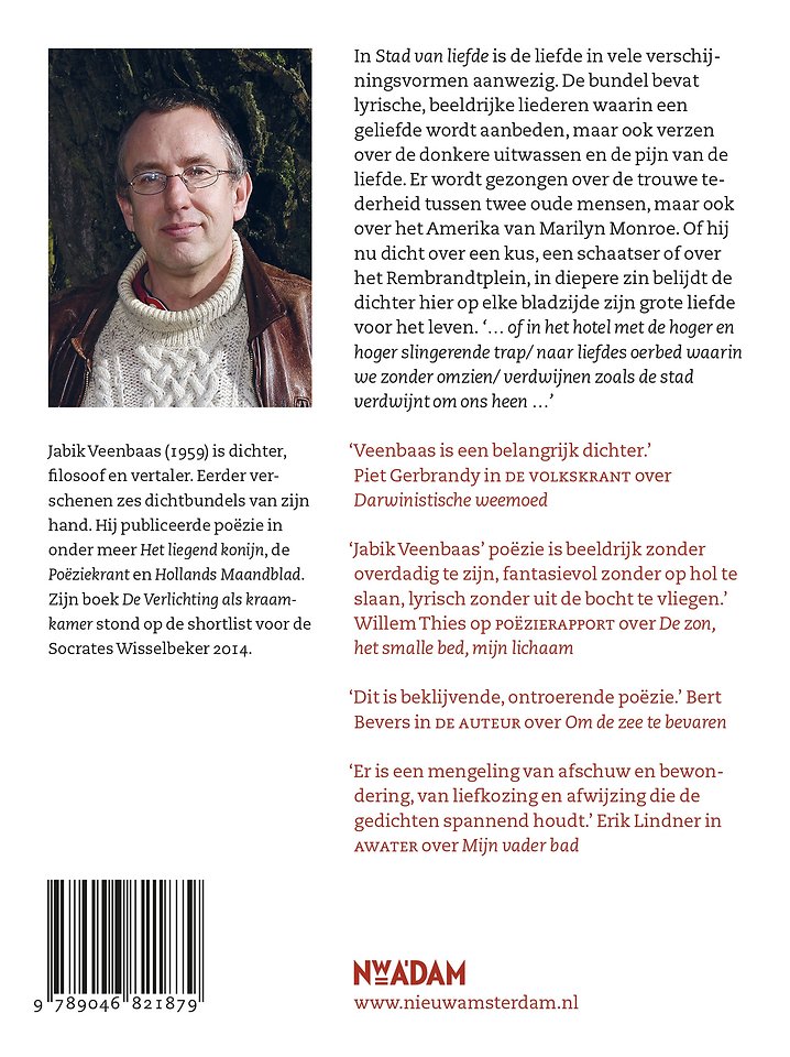 In Stad van liefde, de zevende dichtbundel van Jabik Veenbaas, is de liefde in vele verschijningsvormen aanwezig. Het boek bevat lyrische, beeldrijke liederen waarin een geliefde wordt aanbeden, maar ook verzen over de donkere uitwassen en de pijn van de liefde. Er wordt gezongen over de trouwe tederheid tussen twee oude mensen, maar er wordt ook een verrassend poëtisch antwoord gegeven op de filosofie van Spinoza. Of hij nu dicht over een kus, over een schaatser of over het Amerika van Marilyn Monroe, in diepere zin belijdt de dichter hier op iedere bladzijde zijn grote liefde voor het leven.