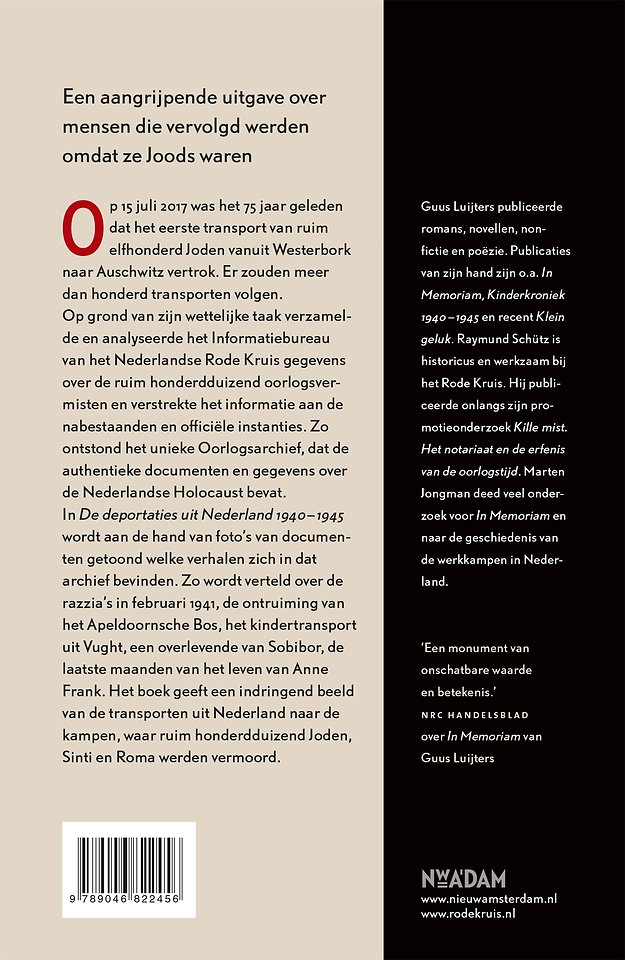 Op 15 juli 2017 is het 75 jaar geleden dat het eerste transport van ruim duizend Joden vanuit Westerbork naar Auschwitz vertrok. Er zouden meer dan honderd transporten volgen. De gegevens over de transporten bevinden zich in het oorlogsarchief van het Nederlandse Rode Kruis, dat dit jaar deze documenten digitaal openbaar toegankelijk zal maken. In De deportaties uit Nederland 1940-1945 wordt aan de hand van foto’s van documenten getoond welke verhalen zich in dat archief bevinden. Zo wordt verteld over de razzia’s in februari 1941, de ontruiming van het Apeldoornse Bos, het kindertransport uit Vught, een overlevende van Sobibor, de laatste maanden van het leven van Anne Frank. Het boek geeft een indringend beeld van de transporten uit Nederland naar de kampen, waar ruim 100.000 Joden, Sinti en Roma werden vermoord.