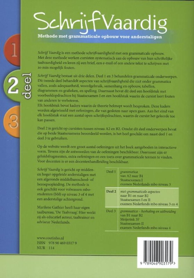 Schrijf Vaardig bestaat uit drie delen. Deel 1 en 3 behandelen grammaticale onderwerpen. Dit tweede deel behandelt aspecten van schrijfvaardigheid die niet onder grammatica vallen, zoals adequaatheid, woordgebruik, samenhang en opbouw, tabellen, diagrammen en grafieken, en spelling. Daarnaast bevat dit deel een hoofdstuk met voorbeeldopdrachten bij Staatsexamen I en een hoofdstuk waarin de cursist leert fouten van anderen te verbeteren.