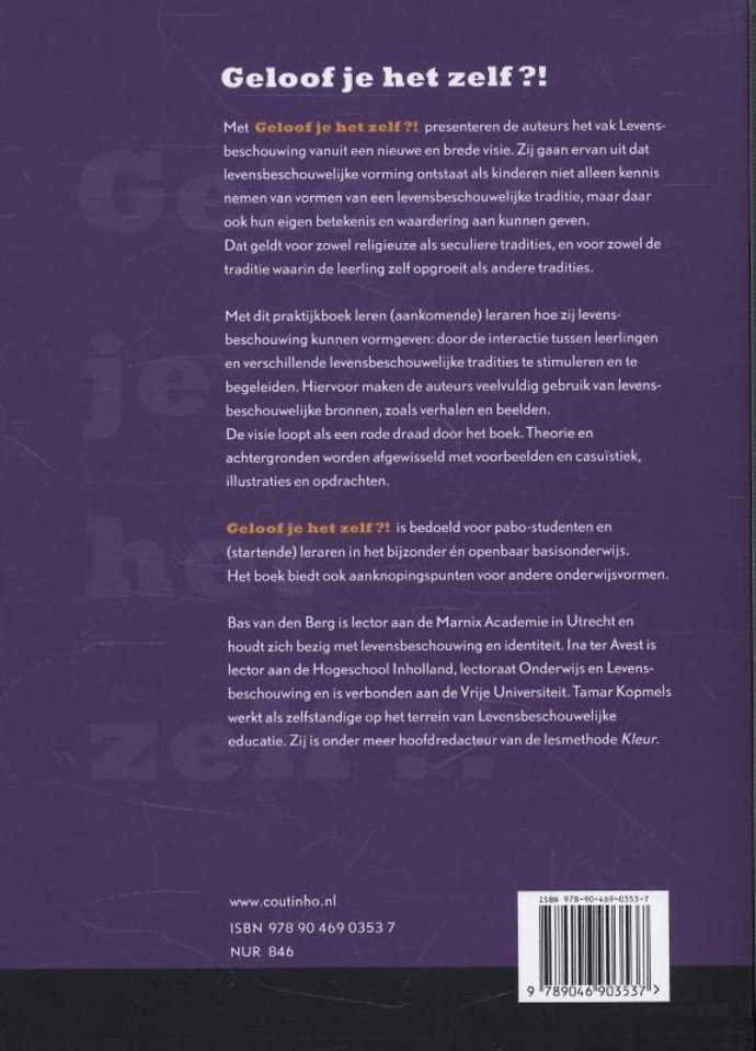 Met Geloof je het zelf?! presenteren de auteurs het vak Levensbeschouwing vanuit een nieuwe visie. Zij gaan ervan uit dat levenbeschouwelijke vorming ontstaat als kinderen niet alleen kennis nemen van vormen van een (religieuze of seculiere) levensbeschouwelijke traditie, maar daar ook hun eigen betekenis en waardering aan kunnen geven. Dat geldt voor de traditie waarin de leerlingen zelf opgroeien én voor andere tradities.