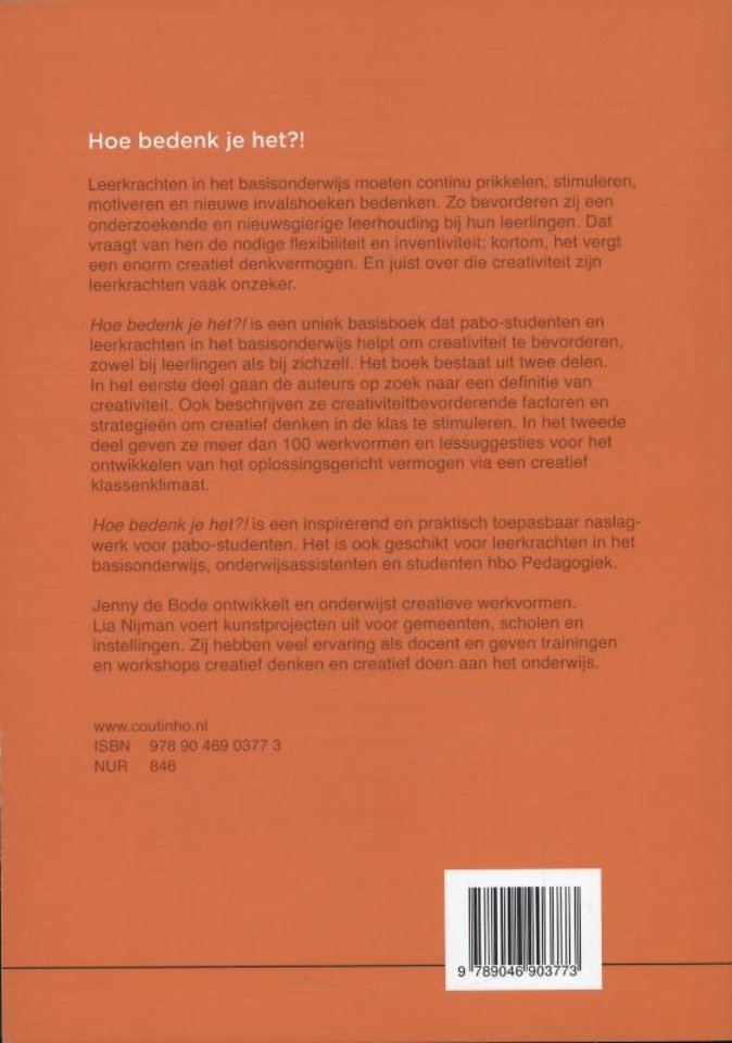 Hoe bedenk je het?! is een uniek basisboek met meer dan 100 denkstrategieën en werkvormen. Naast praktische handvatten biedt het theorie voor het bevorderen van een creatief klassenklimaat en het ontwikkelen van het oplossingsgericht vermogen bij kinderen in alle basisschoolleeftijden (en bij leerkrachten). Met spel in de onderbouw en onderzoekend leren in de bovenbouw worden meningen, oordelen en manieren van denken onderzocht. Kinderen leren ideeën genereren, informatie ordenen en vragen stellen met behulp van vaardigheden als associëren, combineren, verbanden leggen, sorteren en organiseren. Er is ook ruime aandacht voor empathische vaardigheden, waarmee de ontwikkeling van '21st century skills' wordt gestimuleerd in alle jaargroepen. Hierdoor krijgen kinderen beter grip op de wereld waarin ze opgroeien.