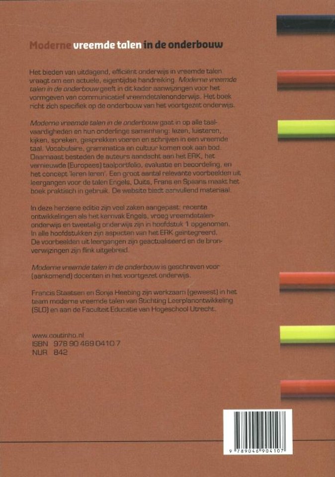 Moderne vreemde talen in de onderbouw gaat in op alle vaardigheden en hun onderlinge samenhang: lezen, luisteren, spreken, gesprekken voeren en schrijven in de vreemde taal. Vocabulaire, grammatica en cultuur komen ook aan bod. Daarnaast besteden de auteurs aandacht aan evaluatie en beoordeling, het ERK, het vernieuwde (Europees) taalportfolio en het concept 'leren leren'. De hoofdstukken sluiten af met bronnen voor verdere verdieping. Een groot aantal relevante voorbeelden en illustraties uit recente leergangen voor de talen Engels, Duits, Frans en Spaans maakt het boek praktisch in gebruik.