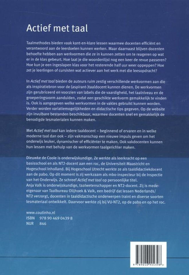 Hoe laat je die woordenlijst nog een keer de revue passeren? Hoe kun je een ingeslapen klas voor het resterende half uur weer oppeppen? Hoe zet je leerlingen of cursisten wat actiever aan het werk met die leesopdracht? In Actief met taal bieden de auteurs ruim zestig verschillende werkvormen aan die als inspiratiebron voor de (aspirant-)taaldocent kunnen dienen. De werkvormen zijn gerubriceerd en voorzien van labels die de vaardigheid, het taalniveau en de groeperingsvorm aanduiden, zodat een geschikte werkvorm gemakkelijk te vinden is. Ook worden variatiemogelijkheden en didactische tips gegeven.