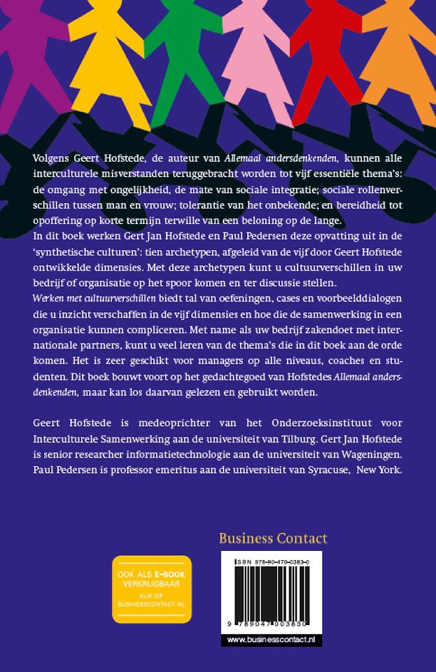 In 'Werken met cultuurverschillen' Gert Jan Hofstede en Paul Pedersen deze opvatting uit in de 'synthetische culturen': tien archetypen, afgeleid van de vijf door Geert Hofstede ontwikkelde dimensies. Met deze archetypen kunt u cultuurverschillen in uw bedrijf of organisatie op het spoor komen en ter discussie stellen. 'Werken met cultuurverschillen' biedt tal van oefeningen, cases en voorbeelddialogen die u inzicht verschaffen in de vijf dimensies en hoe die de samenwerking in een organisatie kunnen compliceren. Met name als uw bedrijf samenwerkt met internationale partners, kunt u veel leren van de thema's die in dit boek aan de orde komen. Het is geschikt voor managers op alle niveaus, alsmede voor coaches en studenten. Het boek bouwt voort op het gedachtegoed van Hofstedes 'Allemaal andersdenken', maar kan los daarvan gelezen en gebruikt worden.