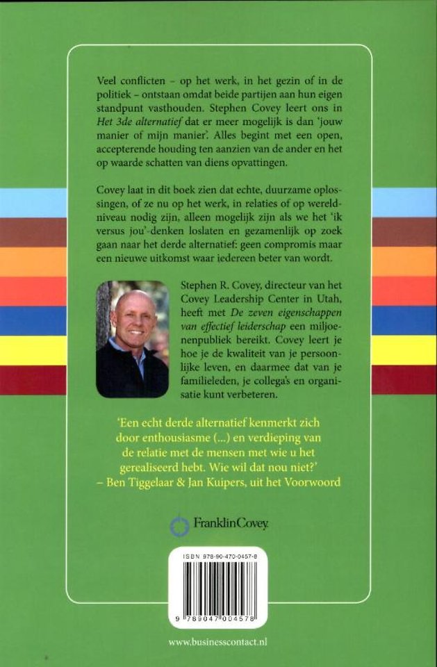 Stephen Covey leert ons in 'Het 3de alternatief' dat er meer mogelijk is dan 'jouw manier of mijn manier'. Hij bouwt daarbij voort op het in 'De zeven eigenschappen' geïntroduceerde concept van synergie. Als synergie serieus wordt nagestreefd - en Covey geeft in dit boek talloze voorbeelden van hoe dat kan, op kleine en grote schaal - zijn er grote en grootse doorbraken mogelijk. Alles begint met een open, accepterende houding ten aanzien van de ander en het op waarde schatten van diens opvattingen.