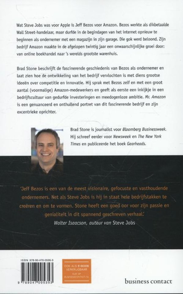 Brad Stone beschrijft de fascinerende geschiedenis van Bezos als ondernemer en laat zien hoe de ontwikkeling van het bedrijf vervlochten is met diens grootse ideeën over competitie en innovatie. Hij sprak met Bezos zelf en met groot aantal (voormalige) Amazon-medewerkers en geeft als eerste een inkijkje in een bedrijfscultuur van gedurfde investeringen en meedogenloze ambitie. Mr. Amazon is een genuanceerd en onthullend portret van dit fascinerende bedrijf en zijn excentrieke oprichter.